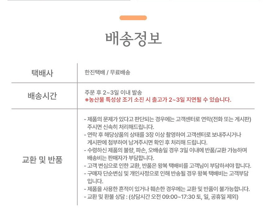 산지사정에 의해 포장이 변경될 수 있으며, 배송일이 2~3일가량 늦어질 수 있습니다.